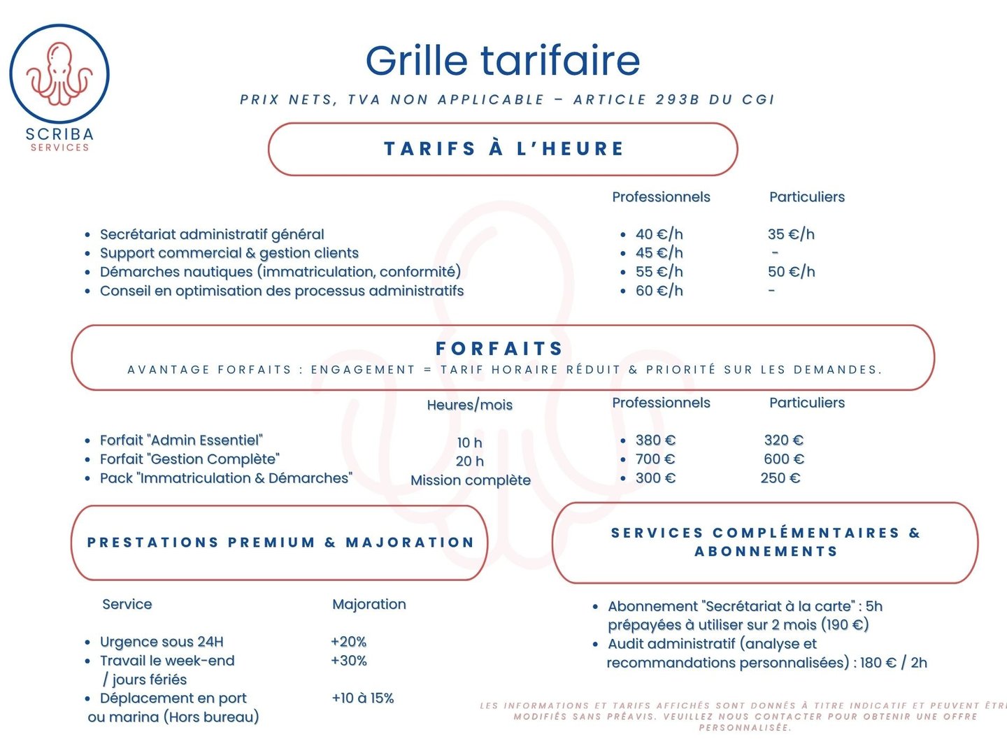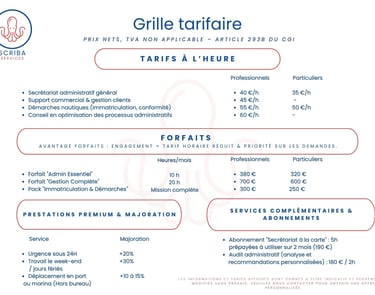 Que vous soyez un professionnel, ou un particulier, bénéficiez d’un accompagnement administratif personnalisé. Découvrez nos tarifs transparents et adaptés à vos besoins.